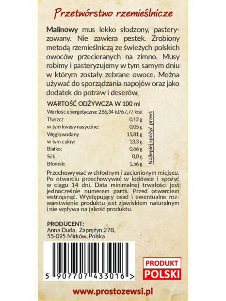 Przepis na soki przecierowe pochodzi od naszych dziadków jeszcze z lat 20 – 30 dwudziestego wieku, czyli ma ponad 100 lat. Dziadek robił soki na niemieckiej ręcznej maszynce na korbę, my zrobiliśmy maszynę elektryczną. Świeże surowe maliny są przecierane, następnie pasteryzowane i rozlewane do butelek. Nasze soki są gęściejsze od soków tłoczonych, ponieważ zawierają przetarty miąższ owoców, zachowują jednak formę płynną.